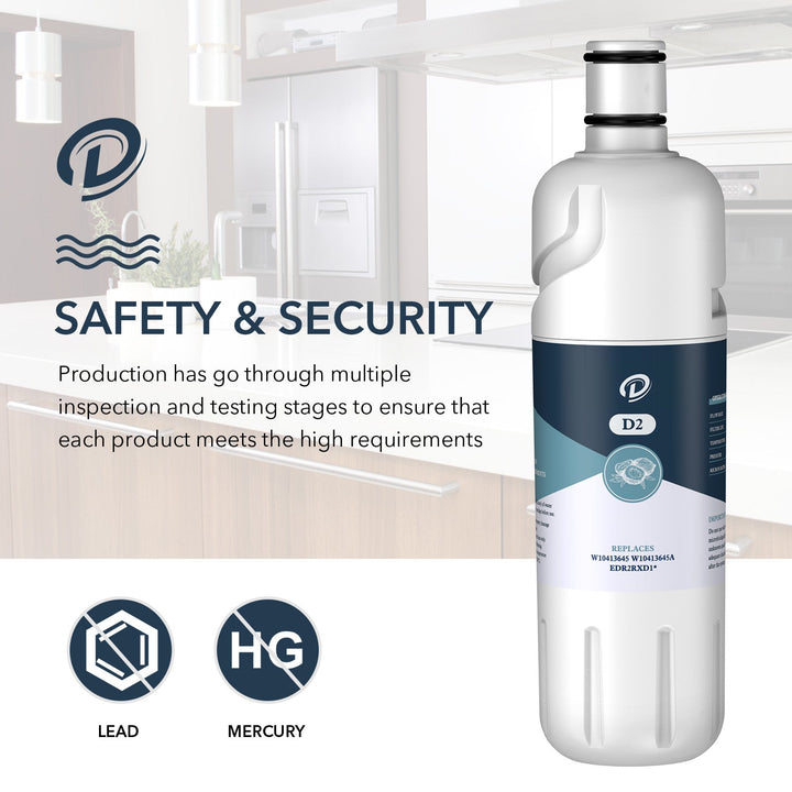 This(D2) refrigerator water filter 1 could reduce 24 impurities in water as well as other harmful contaminants. The fridge filter is compatible with Everydrop Water Filter 2, W10413645A EDR2RXD1 Water Filter and 9082 Water Filter. We recommend to replace the filter every 6 months to ensure the filtration performance.