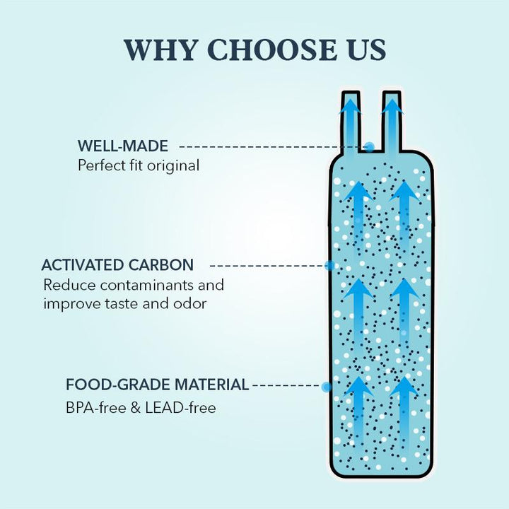 BPA-Free and food-grade materials, Sri Lankan coconut shell carbon block, super adsorption capacity, maximum reduction of harmful impurities contained in drinking water. Compatible with the following models: EDR1RXD1, W10295370A, 9081, Filter 1, W10295370, P4RFWB, rfc3700a, 46-9930, P8KB2L.