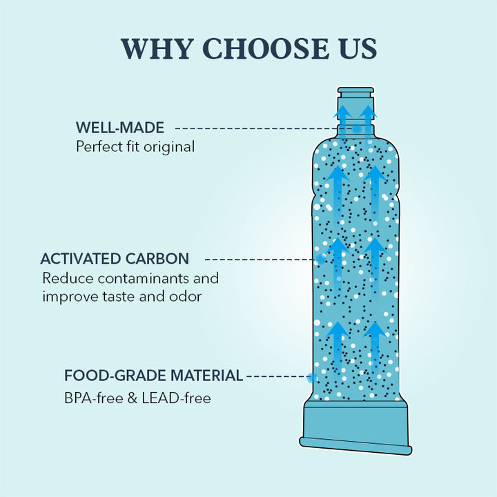 BPA-Free and food-grade materials, Sri Lankan coconut shell carbon block, super adsorption capacity, maximum reduction of harmful impurities contained in drinking water,